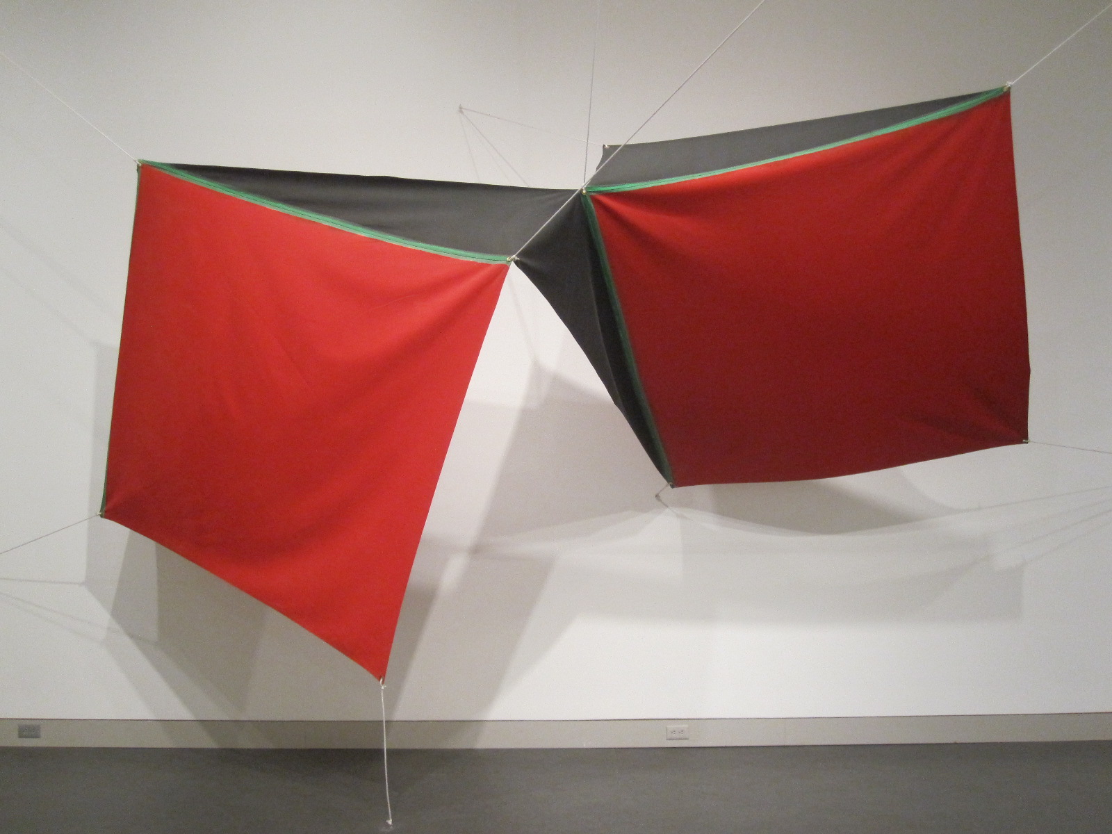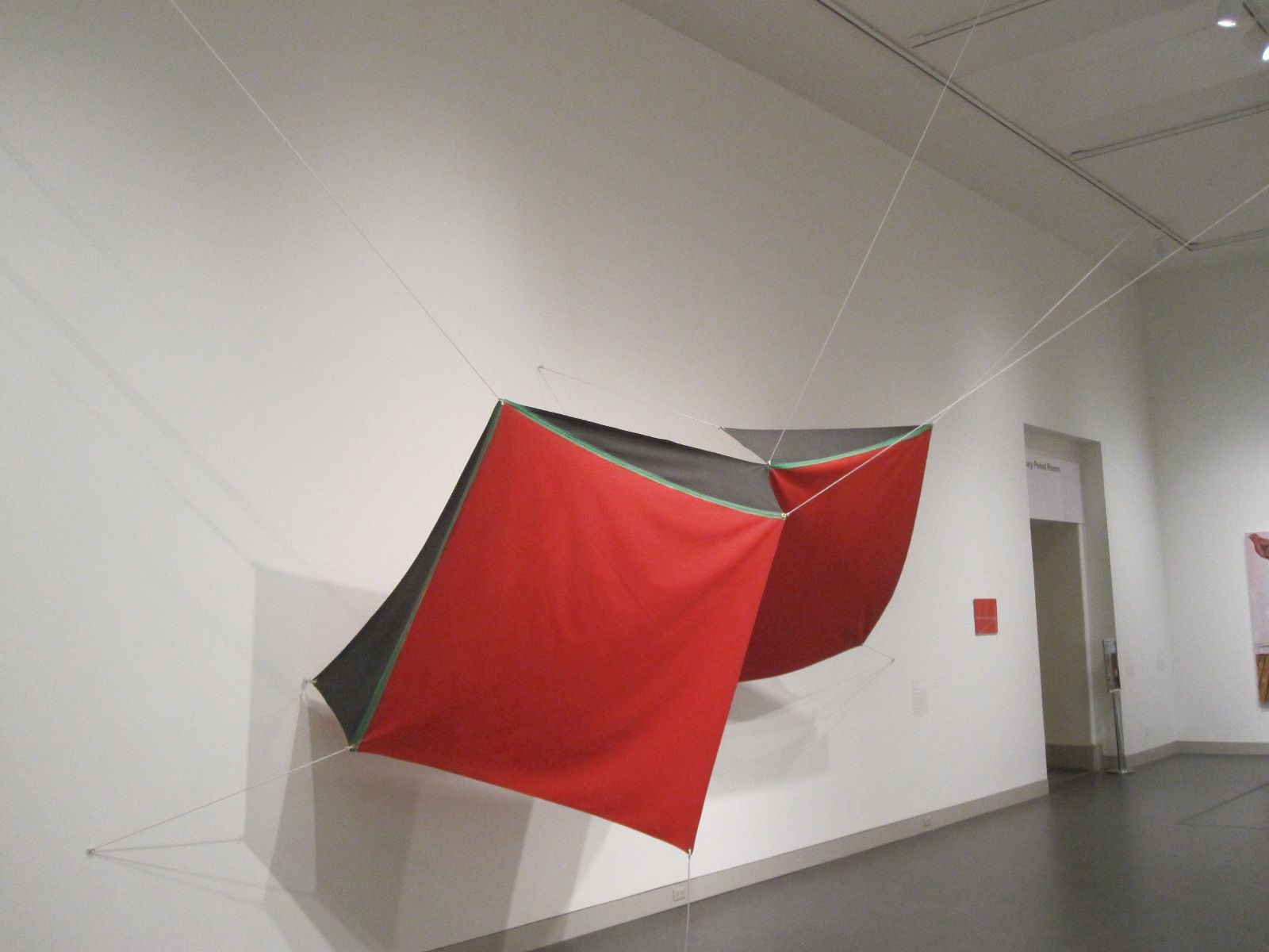 Joe Overstreet’s Power Flight can be seen at the Brooklyn Museum. The work, made in 1971, consists of multiple canvas panel– six of them– stained with acrylic. The panels alternate red and black, except at the machine-sewn seams, which have been painted green. The panels are pulled in various directions by white ropes. These ropes, knotted through grommets in the panels’ corners, extend outward, anchoring the work into the walls, ceiling, and floor of the fourth-floor gallery. The piece looks rather like a box kite slowly unfolding. Or, perhaps, like a tent. The wall text reads: “The resulting angular shape suggests the sort of small nomadic shelters that fascinate the artist– structures easily assembled and disassembled by individuals in flight from threatening situations, both natural and human-made.”