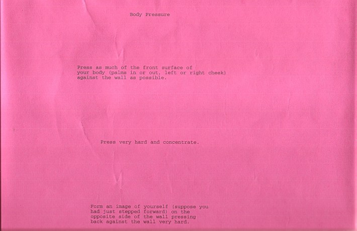 Bruce Nauman’s Body Pressure is on long-term view at Dia:Beacon. The piece, text on paper, sits in a stack on the basement floor. Printed black-on-pink, the poster-sized pages are available for free: take one, please; the stack will be replenished. Nauman’s art often focuses on the body. Body Pressure is noteworthy in that it asks you, the viewer, to focus on your own body.