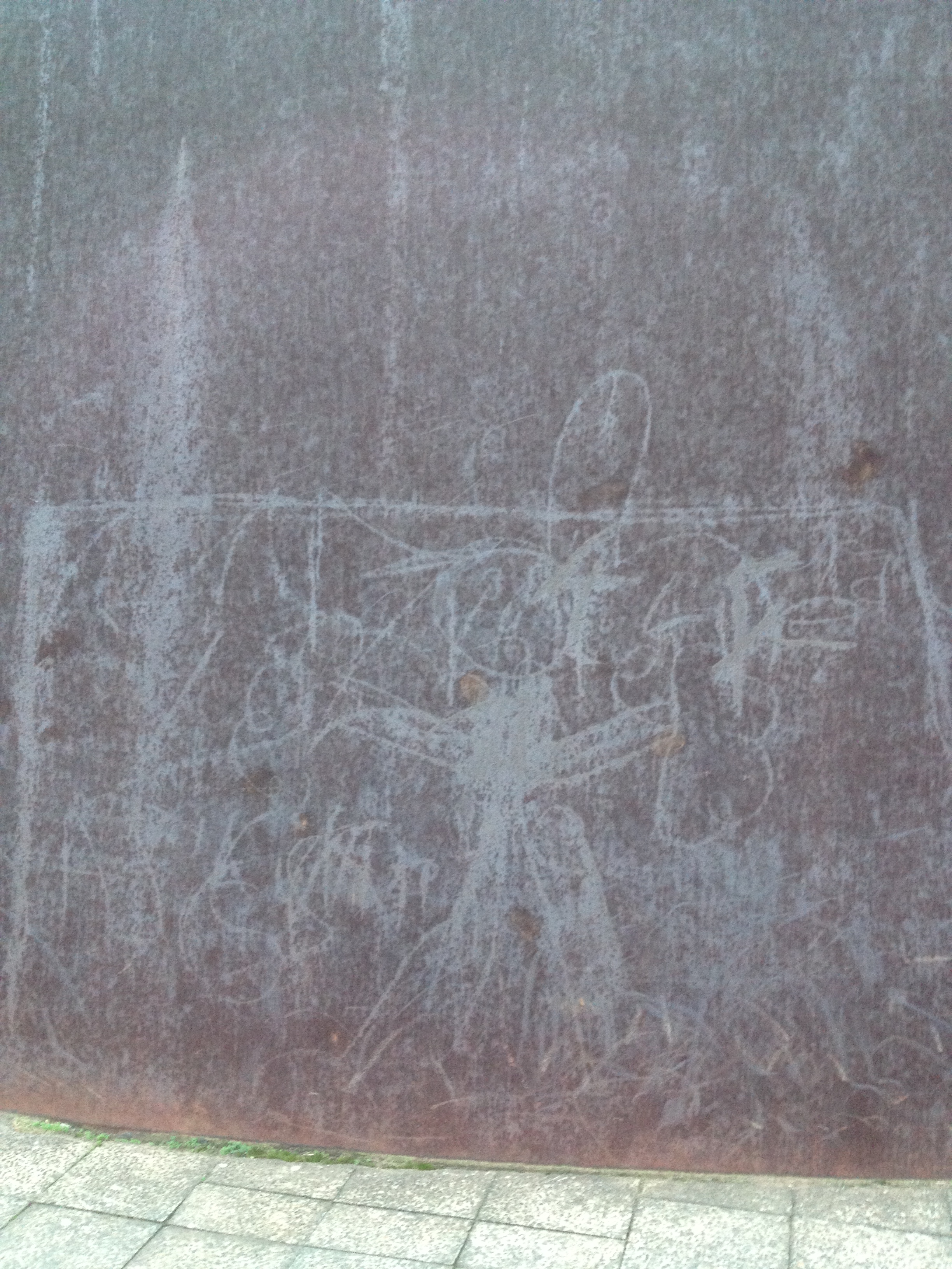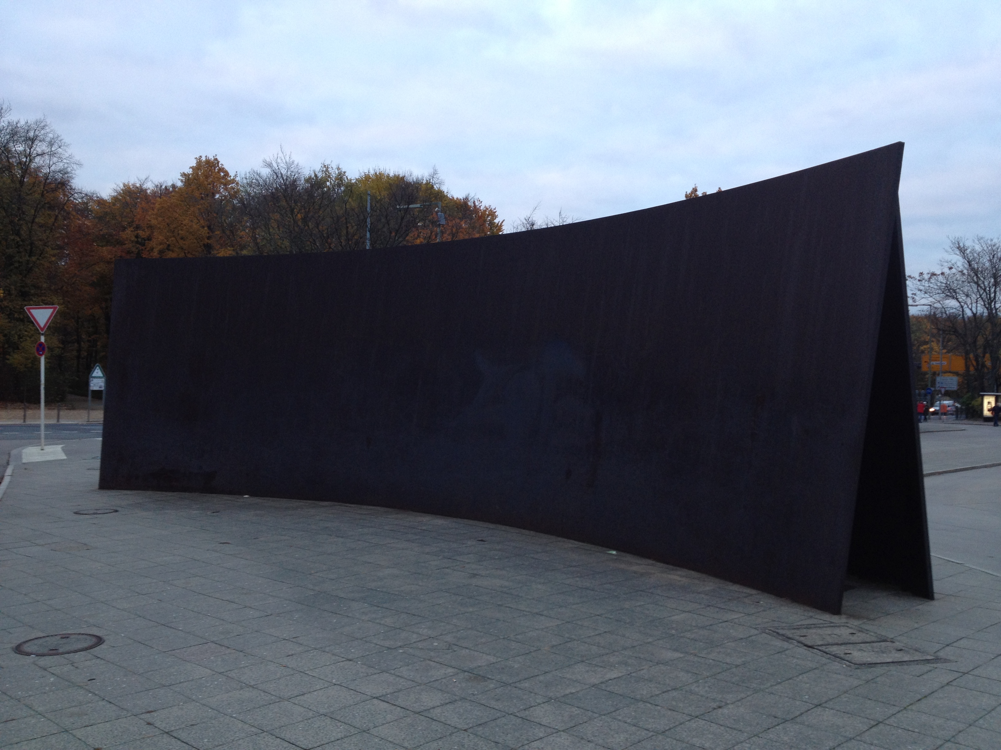 The two bowed, rusted steel plates, placed just a few feet apart, create a kind of narrow corridor, an ominous, affective passage, wide enough to walk through, though not without trepidation, not without awareness of the walls curving and angling toward and away, constricting the space and slivering the sky overhead. If you happen to see it, an inconspicuous bronze plaque set in the nearby flagstones identifies the piece as a memorial to victims of the Nazi eugenics program known as “T4” in which hundreds of thousands of mentally and physically handicapped persons were killed.