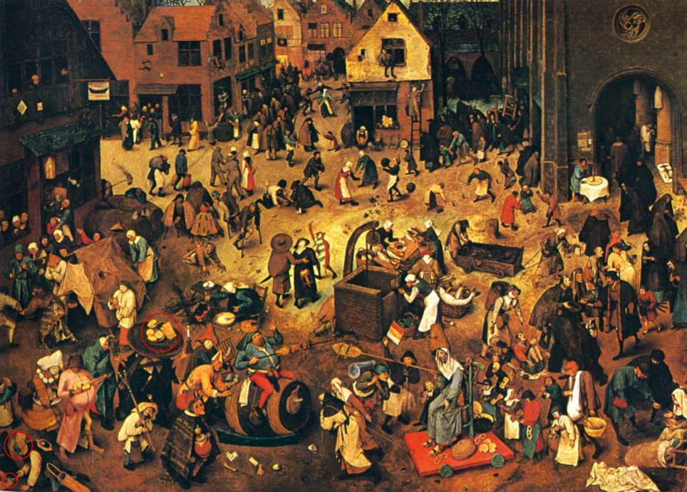 Waffles appear in three distinct places, all in bottom left corner of the composition. I have circled them in red for ease of identification.