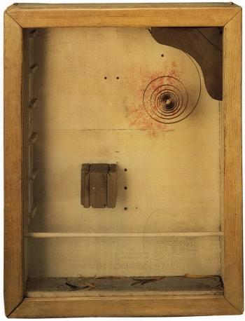 So I re-read this novel I’d mostly forgotten. One of its three plot lines follows Marly, a disgraced art dealer. Josef Virek, a collector and the Croesus of this near-future world, appears to Marly via a “sensory link”: his ailing body resides in a vat in “some hideous industrial suburb of Stockholm.” Upon hiring her to find the source of the Cornell fakes, Virek produces one: “Box of plain wood, glass-fronted. Objects . . .[.]” It contains: