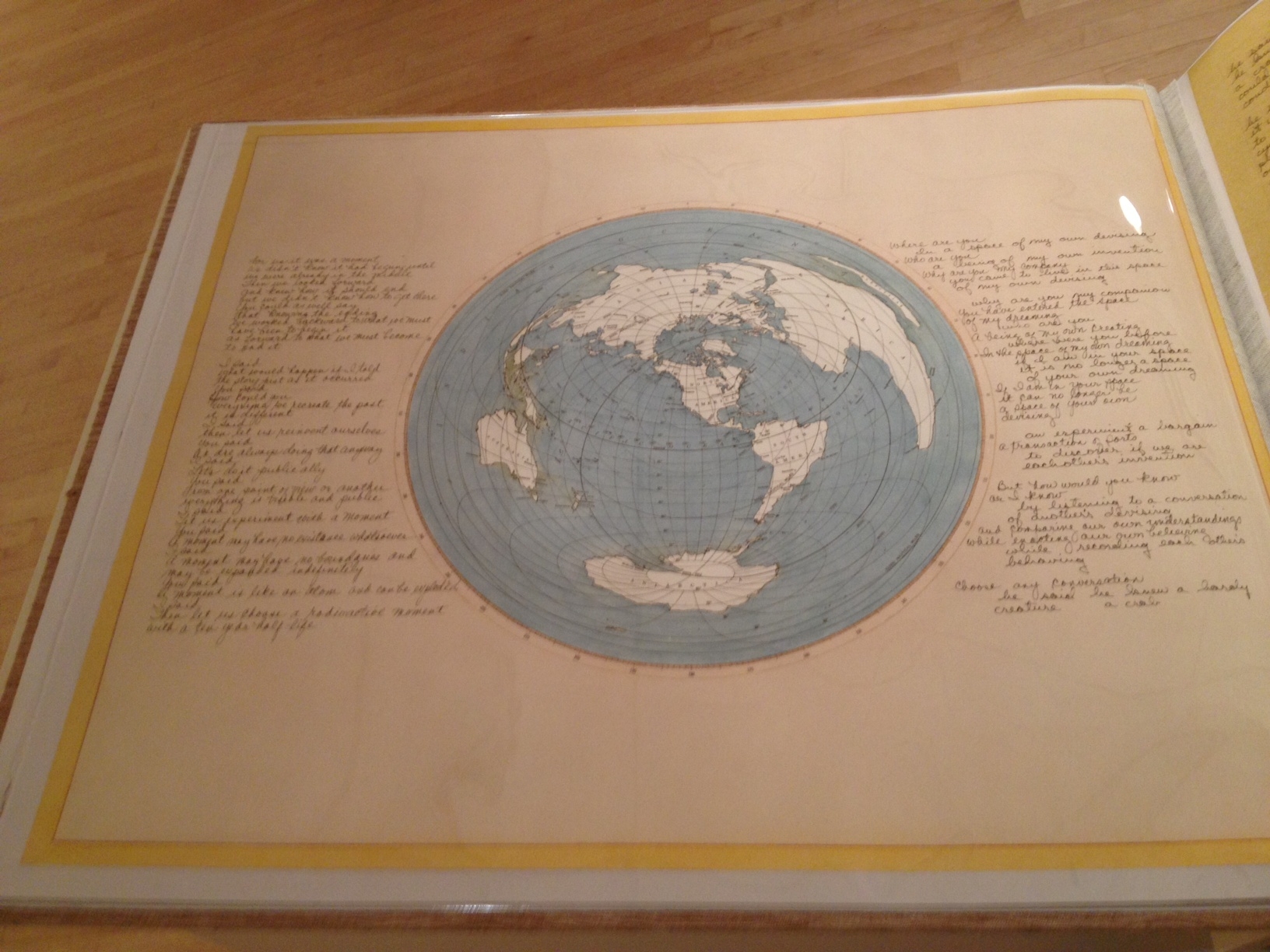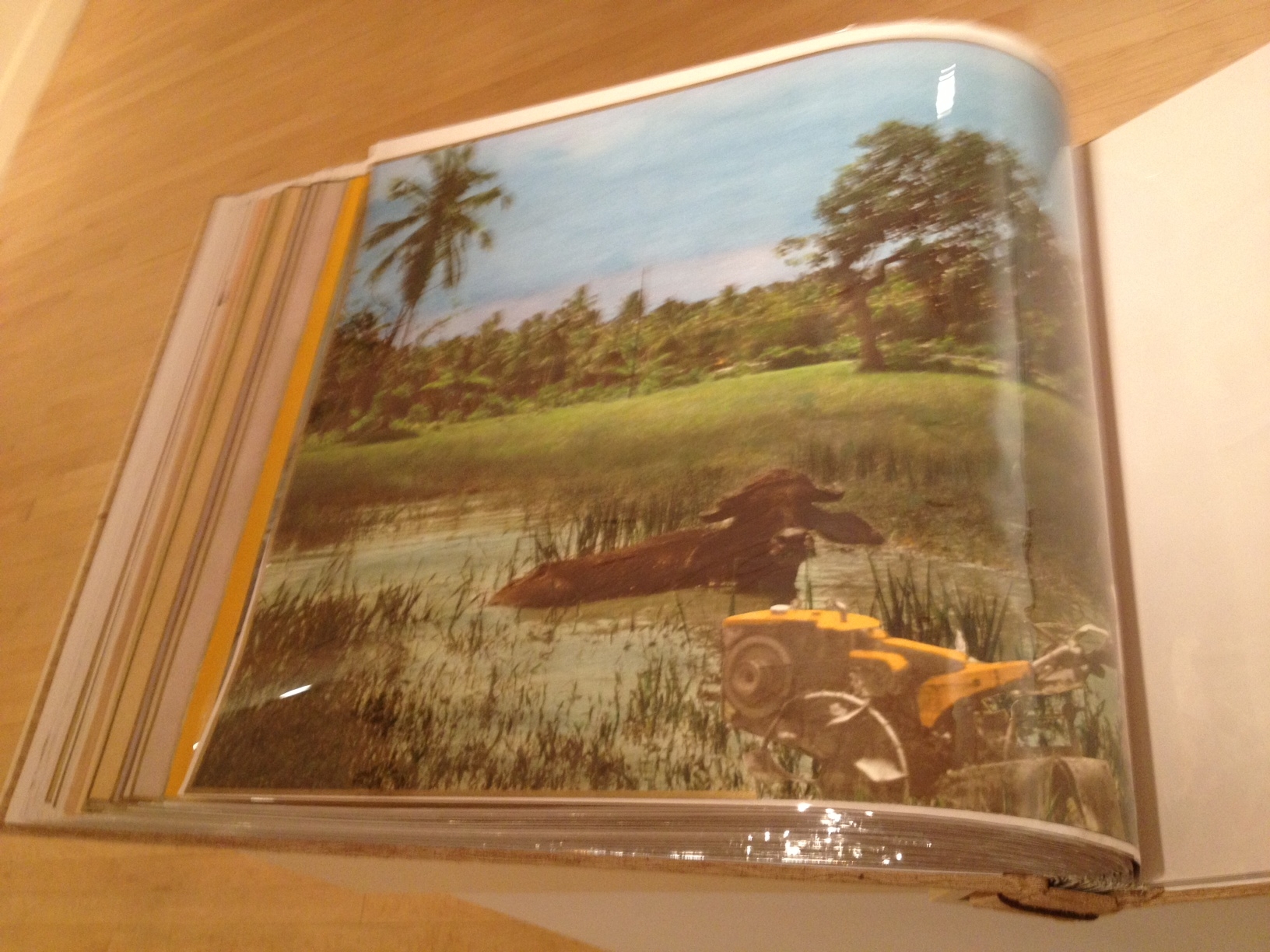 It’s a large book. Each page, a sheet of paper held inside a plastic sleeve, measures, I’d guess, something like twenty-four by eighteen inches. The sleeves are joined at the spine with linen hinges, the covers bound in the same beige cloth. It’s also a beautiful object: in reproduced gouache sketches and hand-tinted photographs, tropical blues and greens contrast with sandy yellows and browns. Handwritten, cursive text works around and through these illustrations, directing movement and varying rhythm. Despite its beauty, it’s possibly not the most approachable work. The size is a bit daunting: turning pages that large can be awkward. The script takes some getting used to. It’s also rather long, probably twenty or so pages, and dense, too. It’s a demanding work.