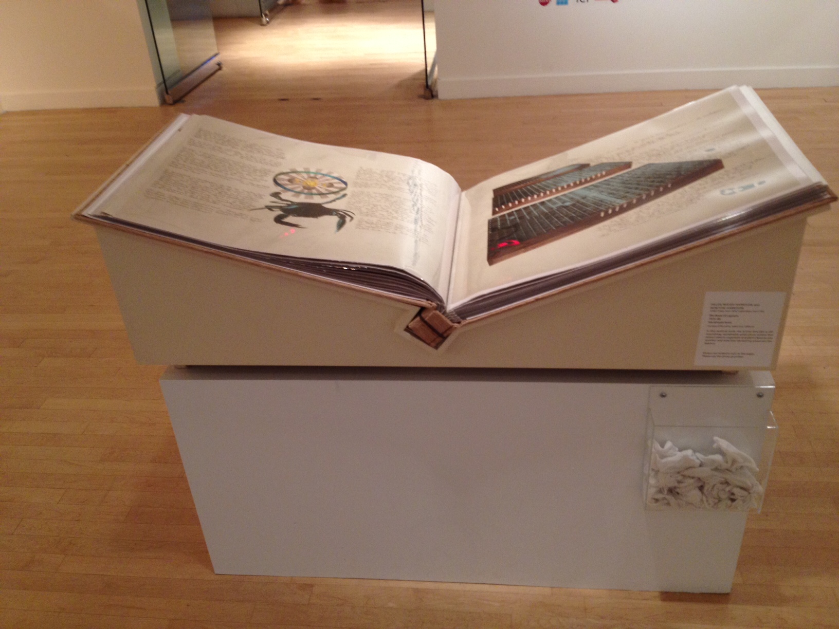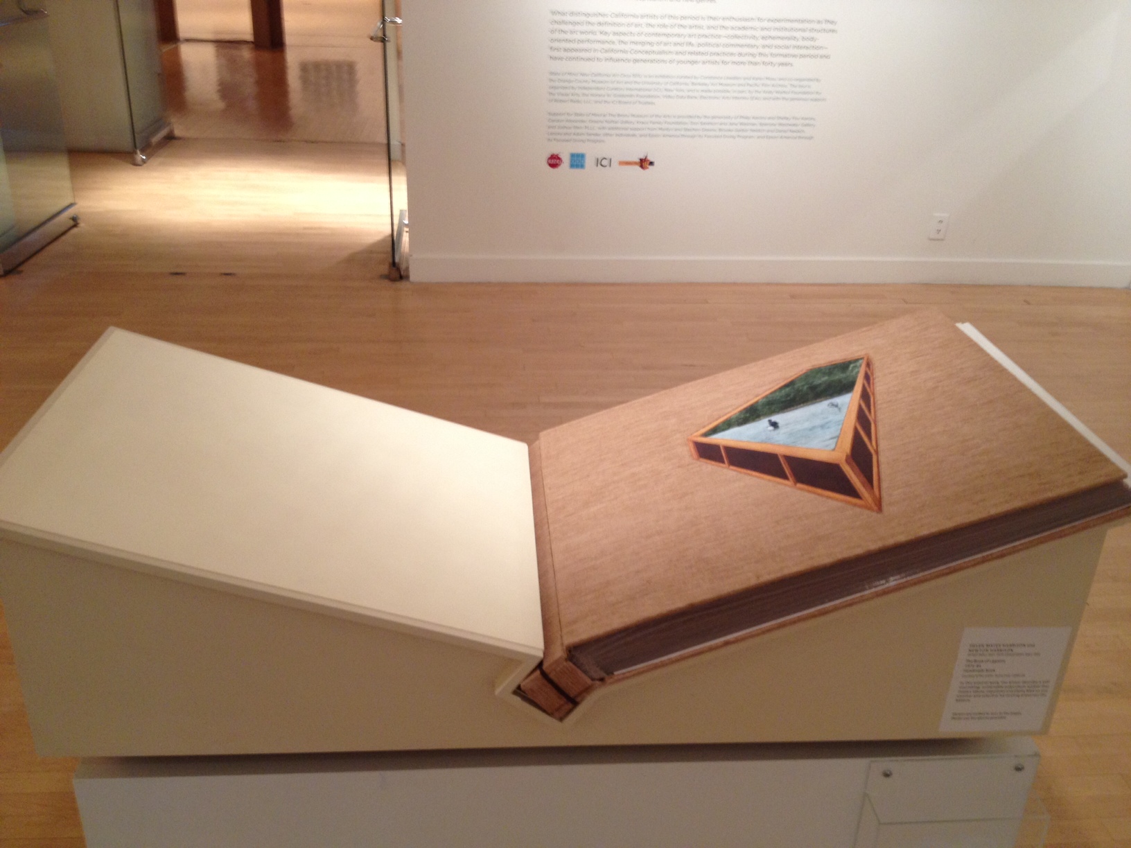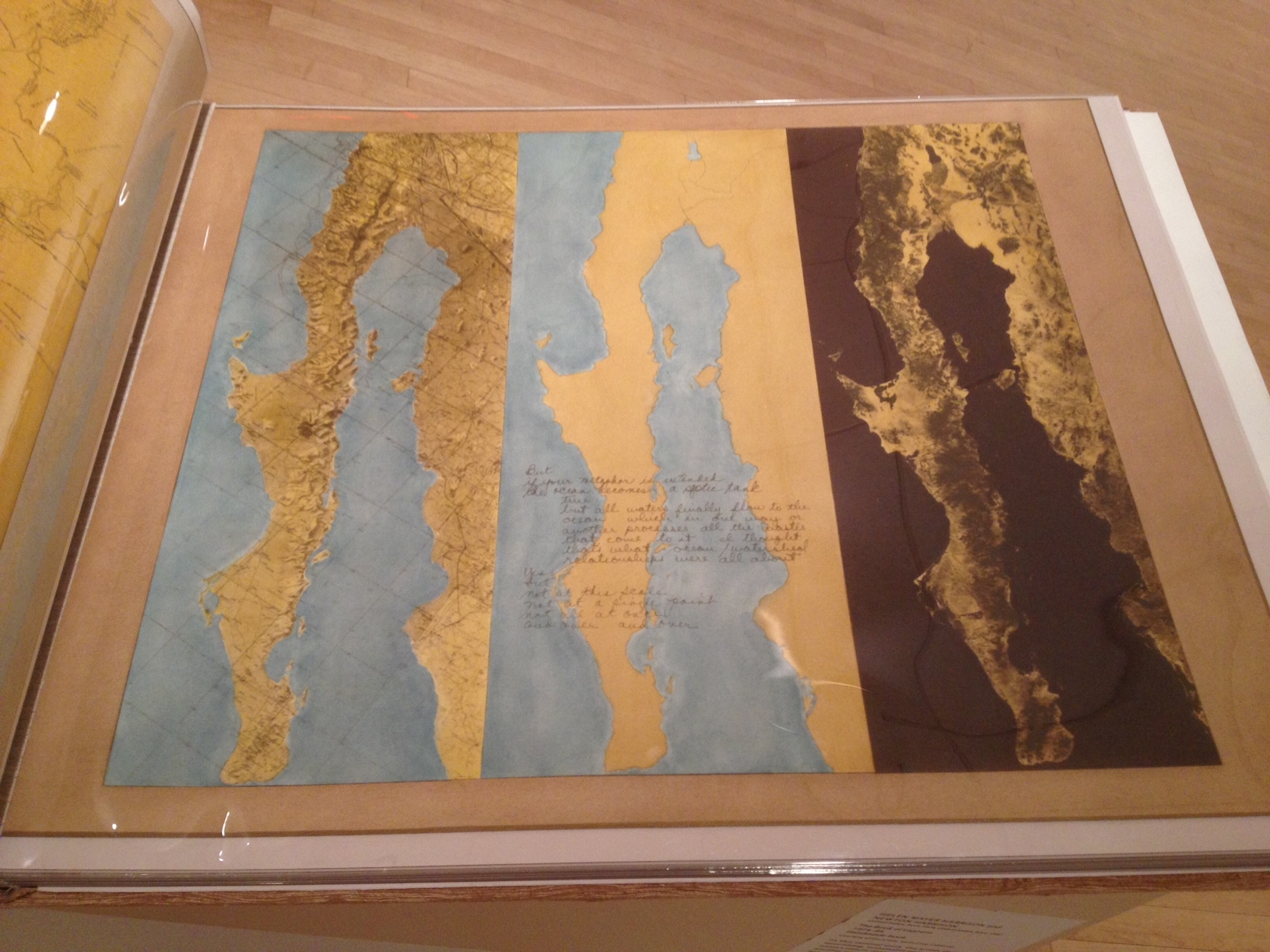 These lines open The Book Of Lagoons1, a work by Helen Mayer Harrison and Newton Harrison in “State of Mind: New California Art circa 1970” at the Bronx Museum of the Arts. And this is how I encountered the book: situated in center of the exhibition’s first room, it was flipped casually to the middle. So to reach the beginning, I had to put on a pair of white gloves and work backward through the pages, which is analogous to what the book’s creators did: