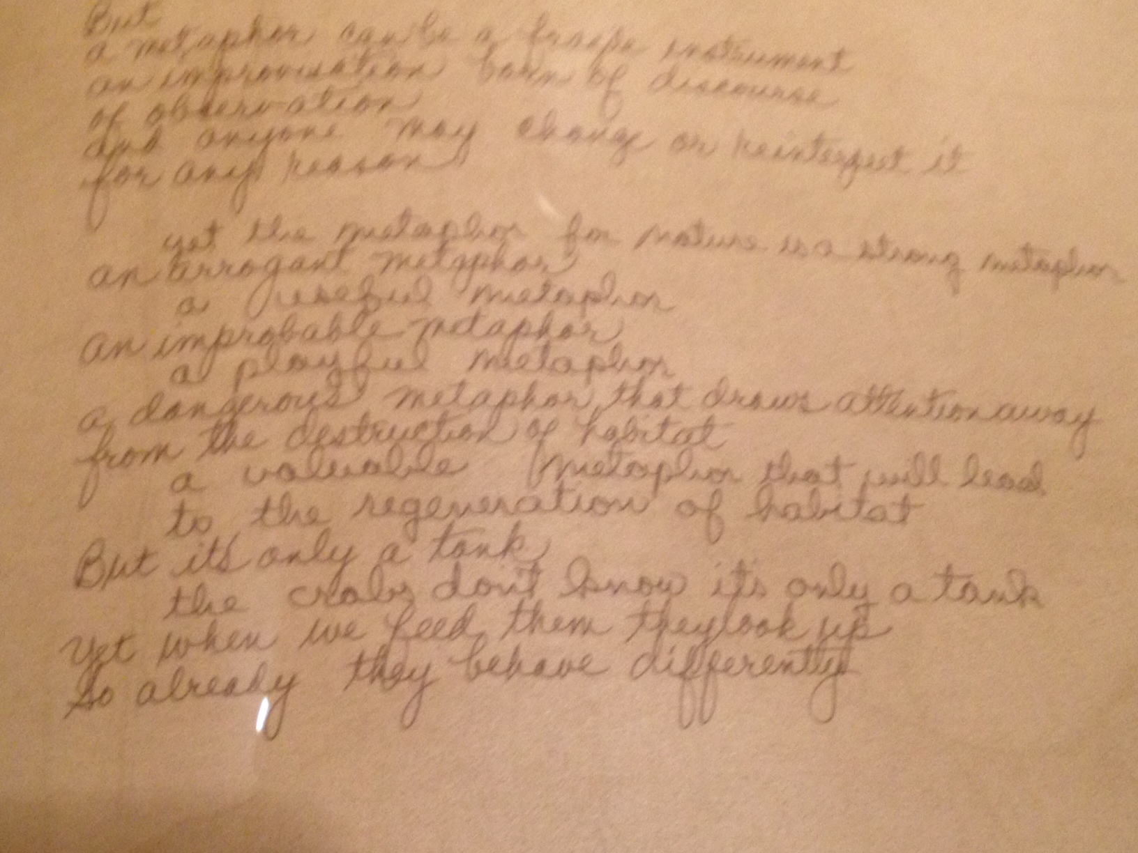 With the fisherman’s information, they plan a tank. First, though, they theorize: “the tank is part of an experiment / and / the experiment is a metaphor for a lagoon[.]” Of course, they realize the limitations of theory and metaphor. The tank is not a lagoon: it “isolates parts of a real lagoon”; it speaks, then, to “alienation,” to “violation,” “to breaking the integrity of a real system.” Still, they hope that they themselves can compensate: they can enter into and complete the system, “become part of the experiment[.]” They’re self-aware: “and we cannot represent this system / without representing ourselves[.]” Ultimately, the experiment is a metaphor for nature: “a serious metaphor”; “an arrogant metaphor”; “a useful metaphor”; “an improbable metaphor”; “a playful metaphor[.]” Only then come the practical bits and anecdotes. A shipment of crabs arrives— “those we ate were delicious / those we experimented / with were hardy[.]” The artists use hosewater to simulate a monsoon, which initiates the mating season; they submerge cinderblocks in the tank, providing cover, standing in for the roots and mud of the mangrove swamps. They tell how a large crab, whom they name “Gigantico,” comes to dominate the rest. Gigantico terrorizes the tank, first cannibalizing other crabs, then just killing them purposelessly. They pen him in a corner, restoring balance. The Book of Lagoons often proceeds in this way, alternating lofty abstractions and hard, particular details: the power and limitations of metaphors on one page, cannibalism on the next.