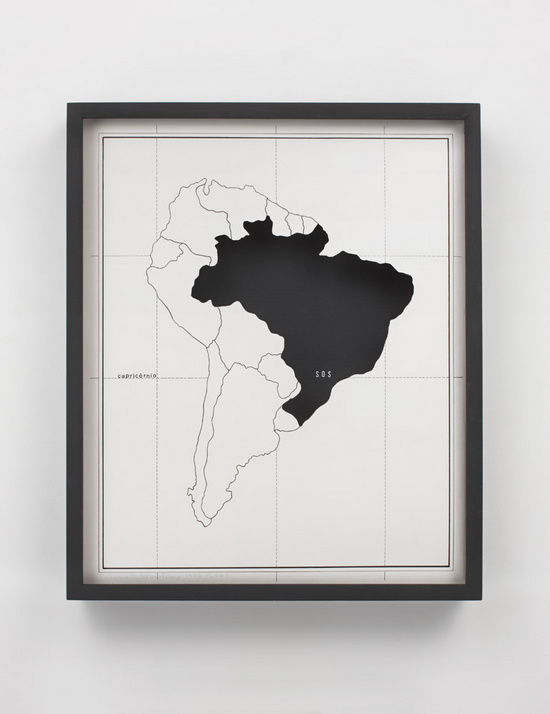 Beyond the appearance of formal rhymes between pictorial and linguistic compositions (e.g. between “concrete art” and “concrete poetry”) I also noticed the occasional intrusion of language or language elements into the works of several artists in the “Sensitive Geometries” show—as in Mira Schendel’s Untitled, 1970, or Anna Maria Maiolino’s Capítulo II, from her Mapas Mentais series, 1976 (below).