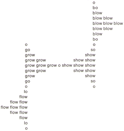 A little further down, the poets make a more explicit connection between their poetics and the aesthetics of the European concrete artists, writing, “Concrete Poetry: tension of things-words in space-time. Dynamic structure: multiplicity of concomitant movements. So in music—by, definition, a time art—space intervenes…; in visual arts—spatial, by definition—time intervenes (Mondrian and his Boogie-Woogie series; Max Bill; Albers and perceptive ambivalence; concrete art in general).” While the relationship between Concrete Poetry and Concrete Art remains enigmatic here, or less than fully articulated, what is clear is that the Concrete poets mean to establish a network of associations that includes certain key international figures, as well as “concrete art in general.”