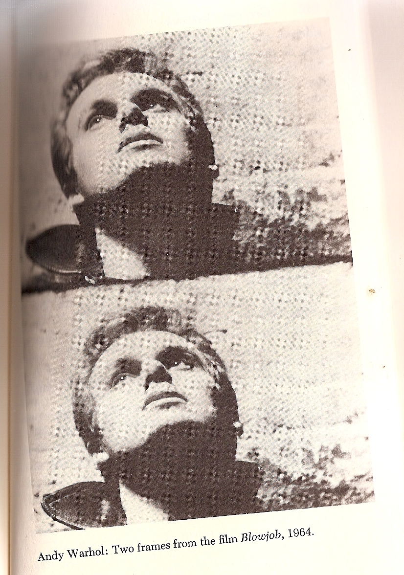 One gem, however, to which I’d like to call attention, and which I’d likely not have encountered outside of The New Art, is Battcock’s own “Humanism and Reality— Thek and Warhol,” in which he juxtaposes discussion of one of Paul Thek’s “meat pieces” and Andy Warhol’s film Blow Job.4 It’s a good pairing, I think, but one sentence in particular jumps out: about the film, Battcock asserts, “The presentation of the material in Blow Job is, once again, ‘anthological’— a mirror image, so to speak, presenting demands on our attention, that are entirely without regard for that image’s relation to the dialectic of the story.” The anthologist champions an “anthological” art, by which I take him to mean an art that problematizes questions of context.5 So, Blow Job6 is, merely, a limited view, static and indirect, of the titular act; there’s a natural progression, a beginning and end, but, story-wise, there’s certainly nothing dialectical about it.