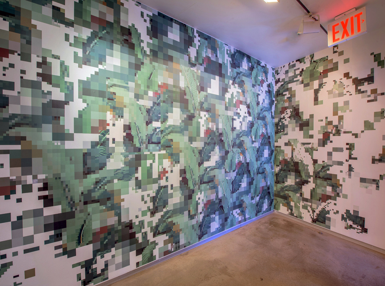 Joiri Minaya, “Redecode: a tropical theme is a great way to create a fresh, peaceful, relaxing atmosphere,” 2015, Wallpaper, 18 x 9.25 ft. Photo credit Roy Rochlin. From the artist’s website.