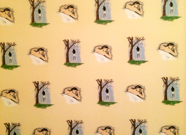 Minaya’s critical quotation of colonial “taste” certainly sets her wallpaper at odds with the “free beauty” of Kant’s ideal wallpaper, which has “no intrinsic purposiveness,” and so, by definition, could have no critical edge. “Redecode” thus locates itself amongst other politically-conscious artworks in the medium of wallpaper, such as Donald Moffett’s “He Kills Me,” 1987, or Robert Gober’s “Male and Female Genital Wallpaper,” 1989 and “Untitled (Hanging Man/Sleeping Man),” 1989.