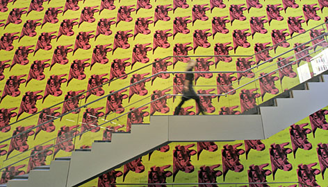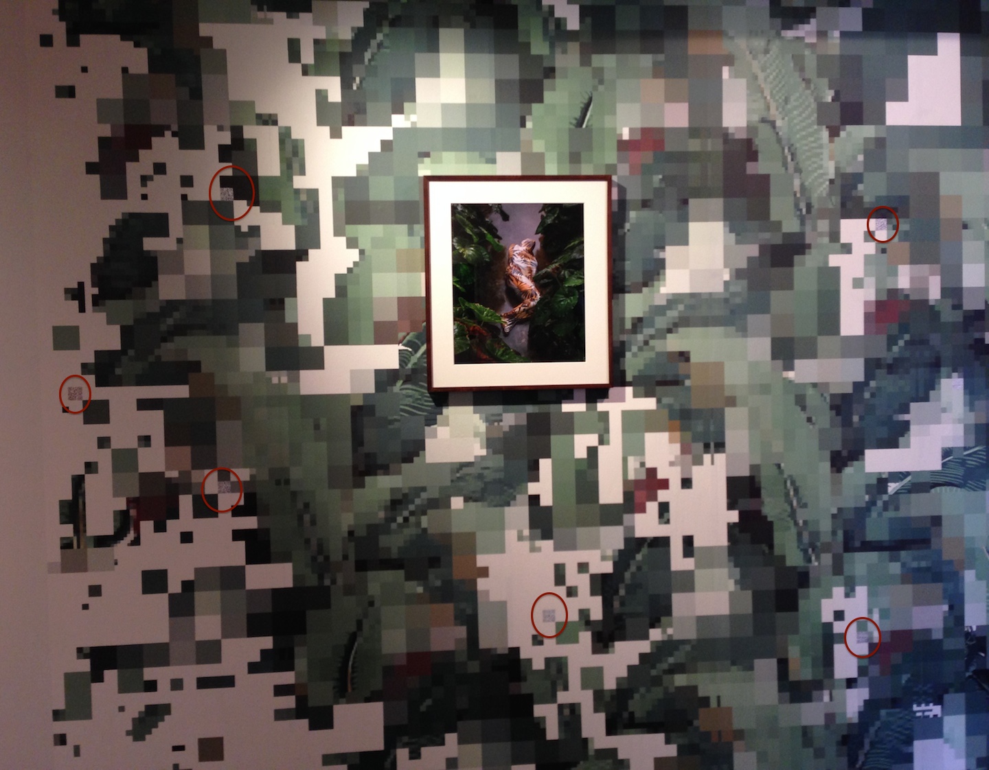 But, in addition to its political valence—a feature it shares in common with the wallpapers by Gober and Moffett above—there is another aspect of “Redecode” that makes it a poor example (in the best sense) of Kant’s ideally decorative, nonreferential, non-purposive wallpaper: embedded at apparently random intervals in the wallpaper’s design are (Quick Response) QR codes of varying sizes, all of which link to “tropical”-themed products and images found on the internet.
